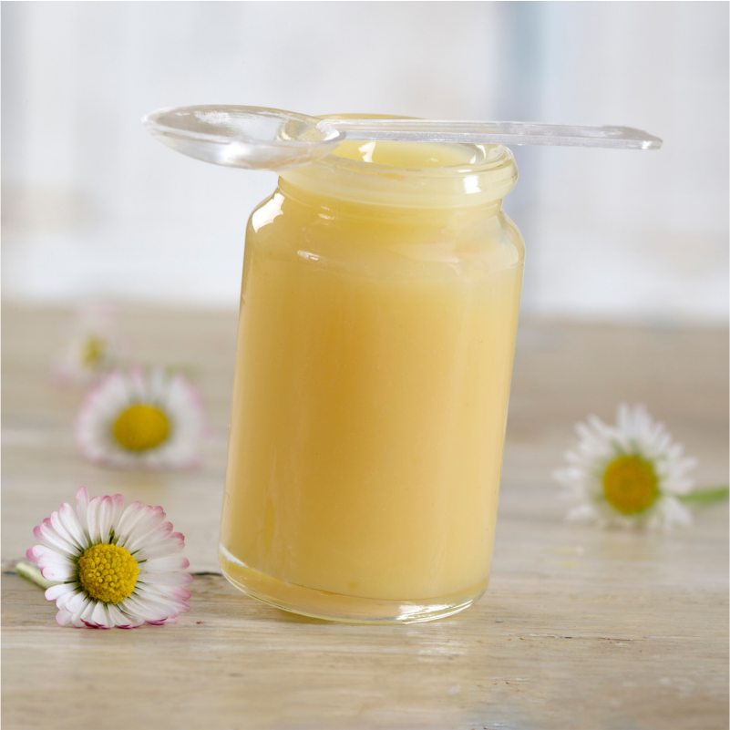 La jalea real es una sustancia segregada por las glándulas hipofaríngeas de la cabeza de abejas obreras jóvenes de abejas melíferas, de entre cinco y diez días, que, mezclada con secreciones estomacales, sirve de alimento a todas las larvas durante los primeros tres días de vida. Solo la abeja reina y las larvas de celdas reales que darán origen a una nueva reina son alimentadas siempre con jalea real. Es una sustancia viscosa de un suave color amarillo y sabor ácido.